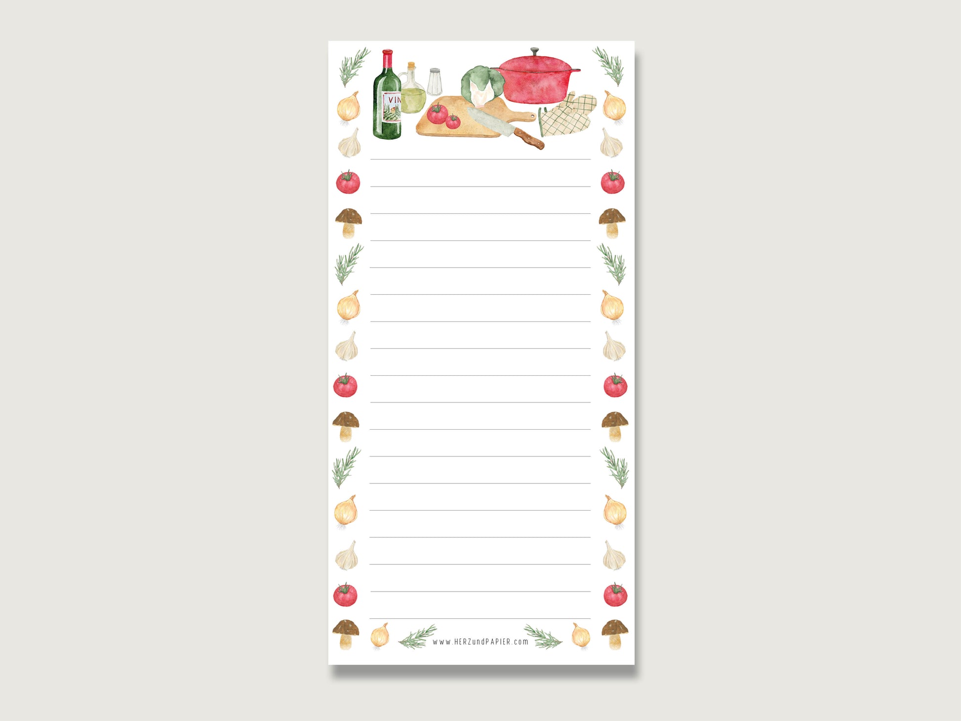 Leckeres Essen mit netten Leuten macht uns bekanntlich glücklich. Diese liebevoll illustrierte Einkaufsliste sorgt schon beim Einkaufen für Vorfreude aufs Kochen.