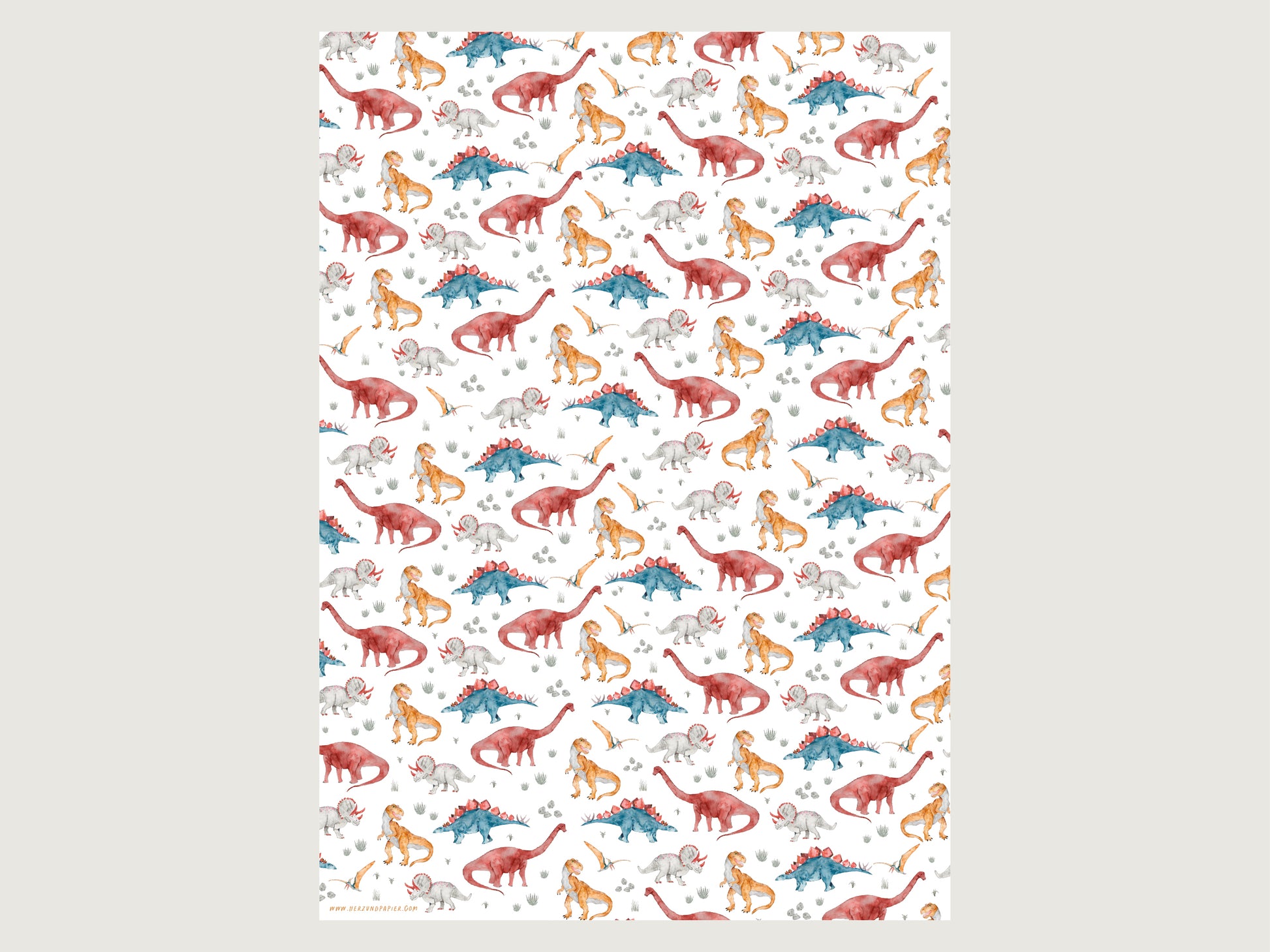 Liebevoll illustriertes Geschenkpapier mit handgemalten Dinos. Flugsaurier, Langhals oder Tyrannosaurus Rex - da kommt jeder Dino-Liebhaber auf seine Kosten.