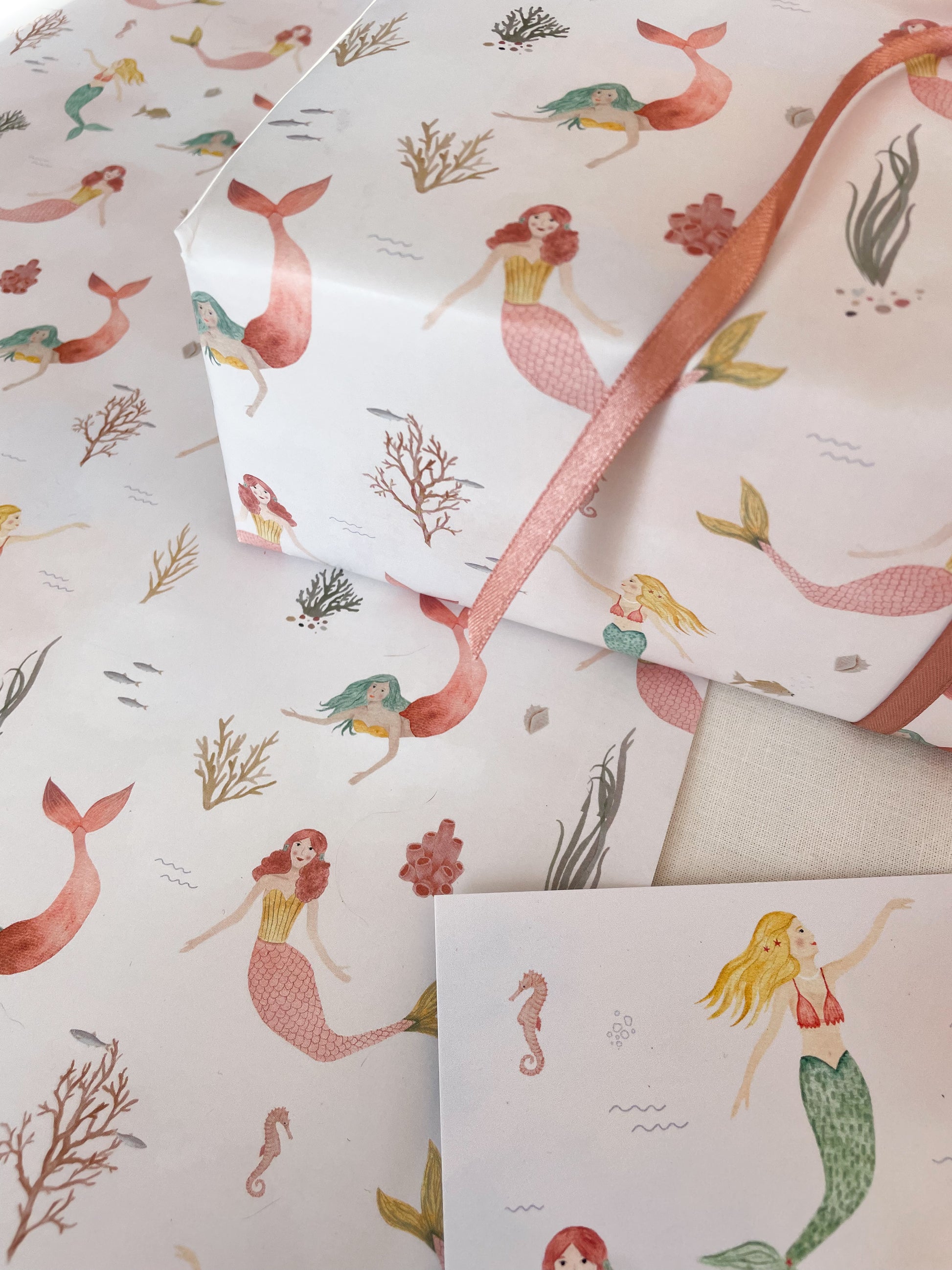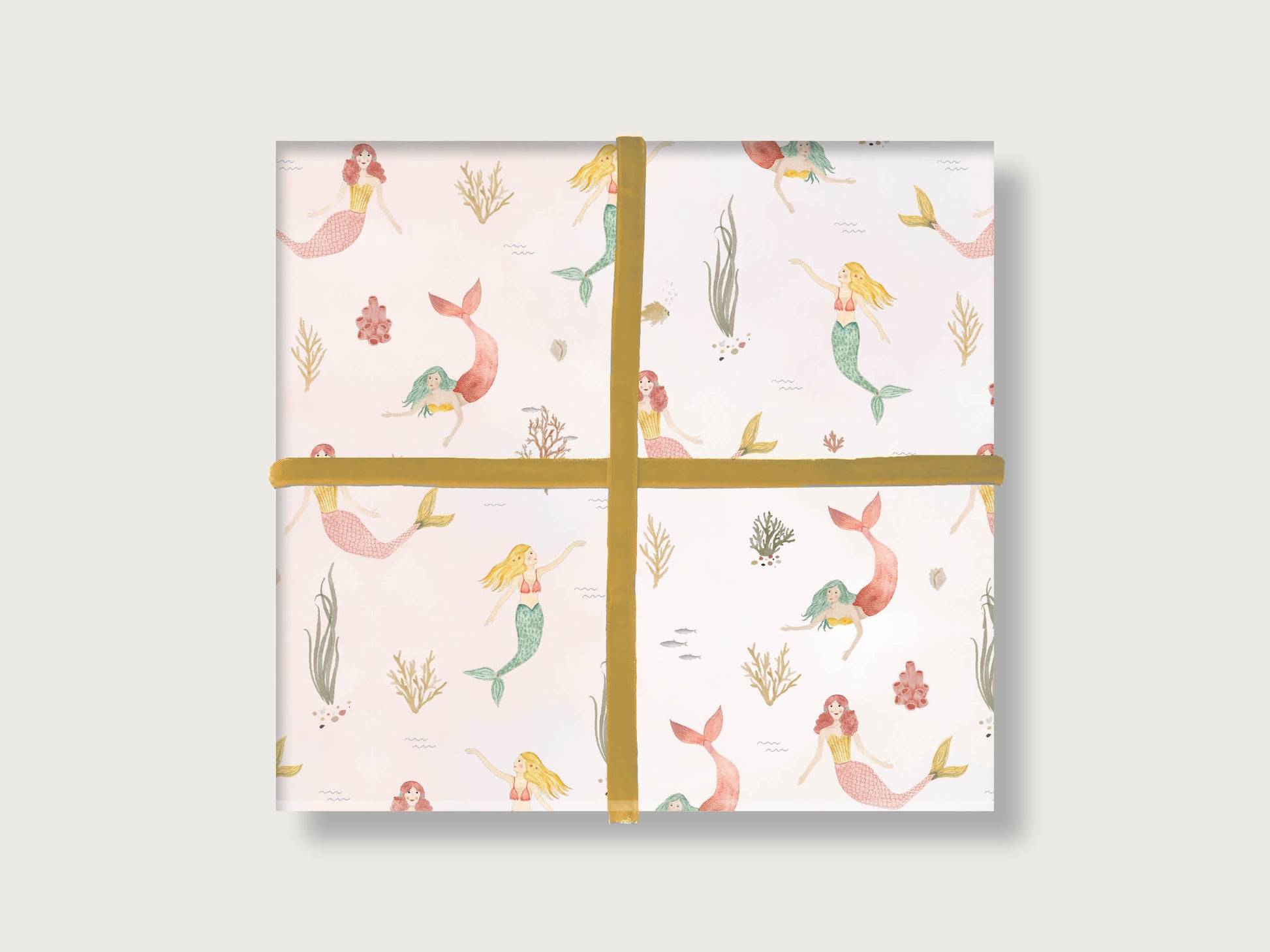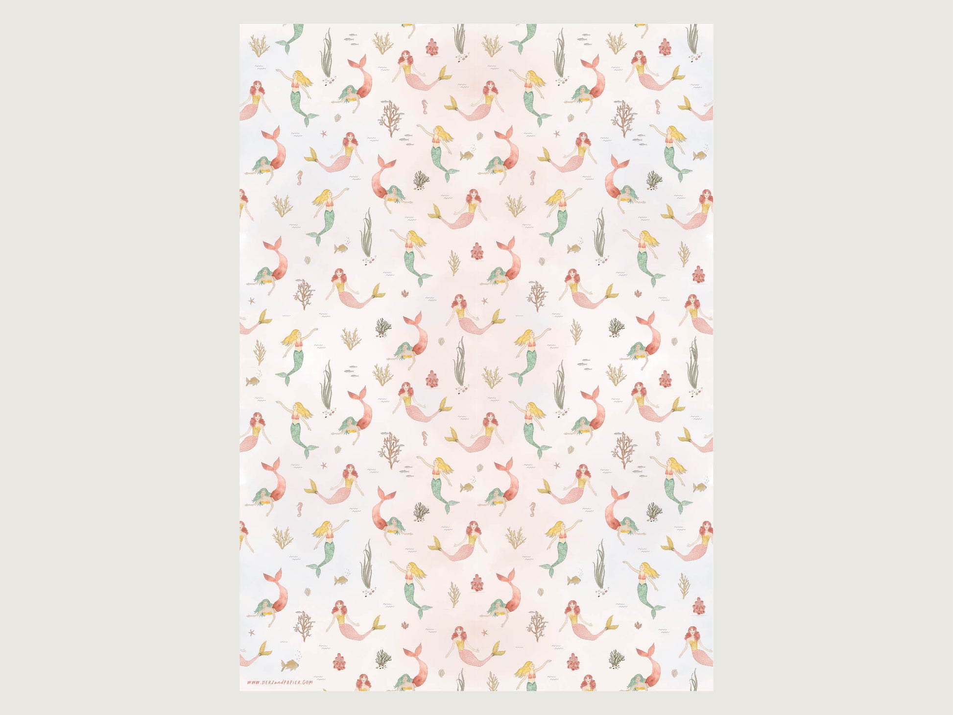 Liebevoll illustriertes Geschenkpapier mit handgemalten Motiven für einen lieblichen Meerjungfrauen-Geburtstag.