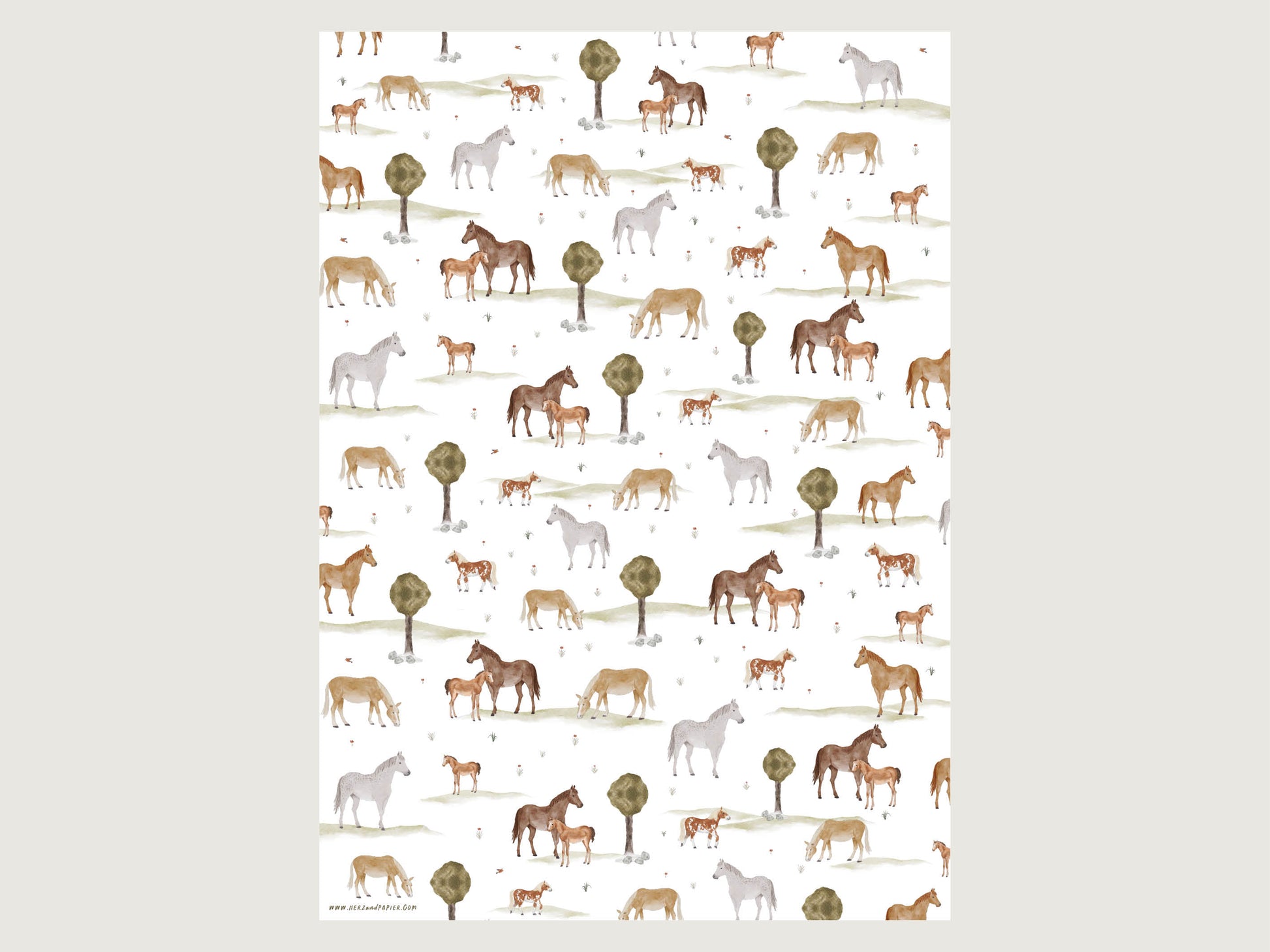 Liebevoll illustriertes Geschenkpapier mit handgemalten Motiven für einen lieblichen Pferde-Geburtstag.