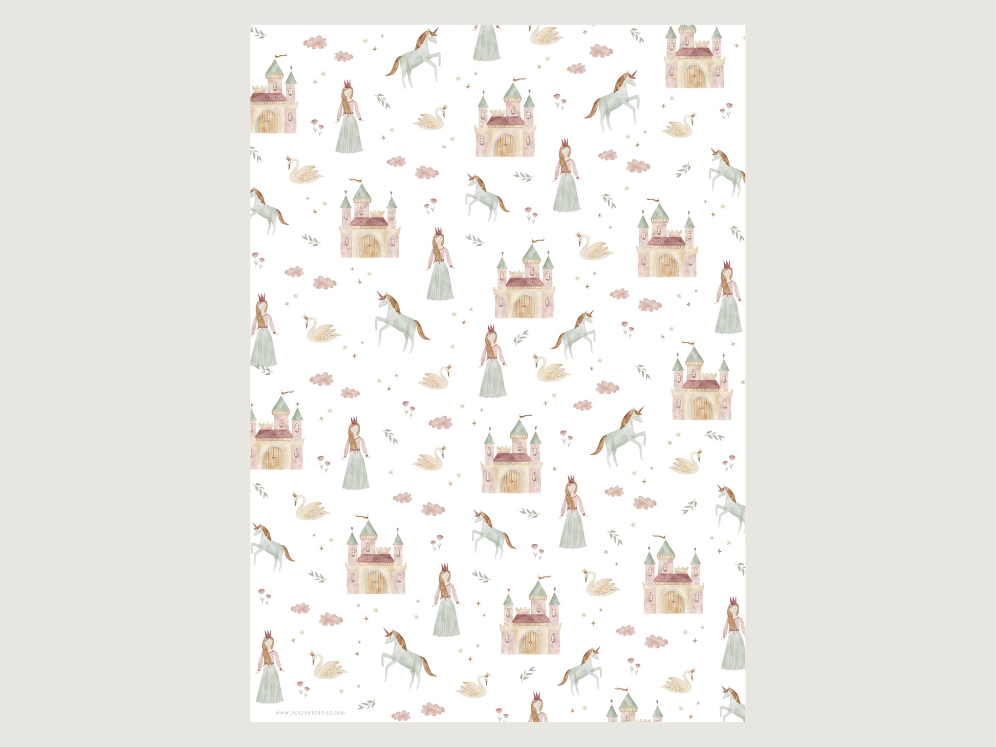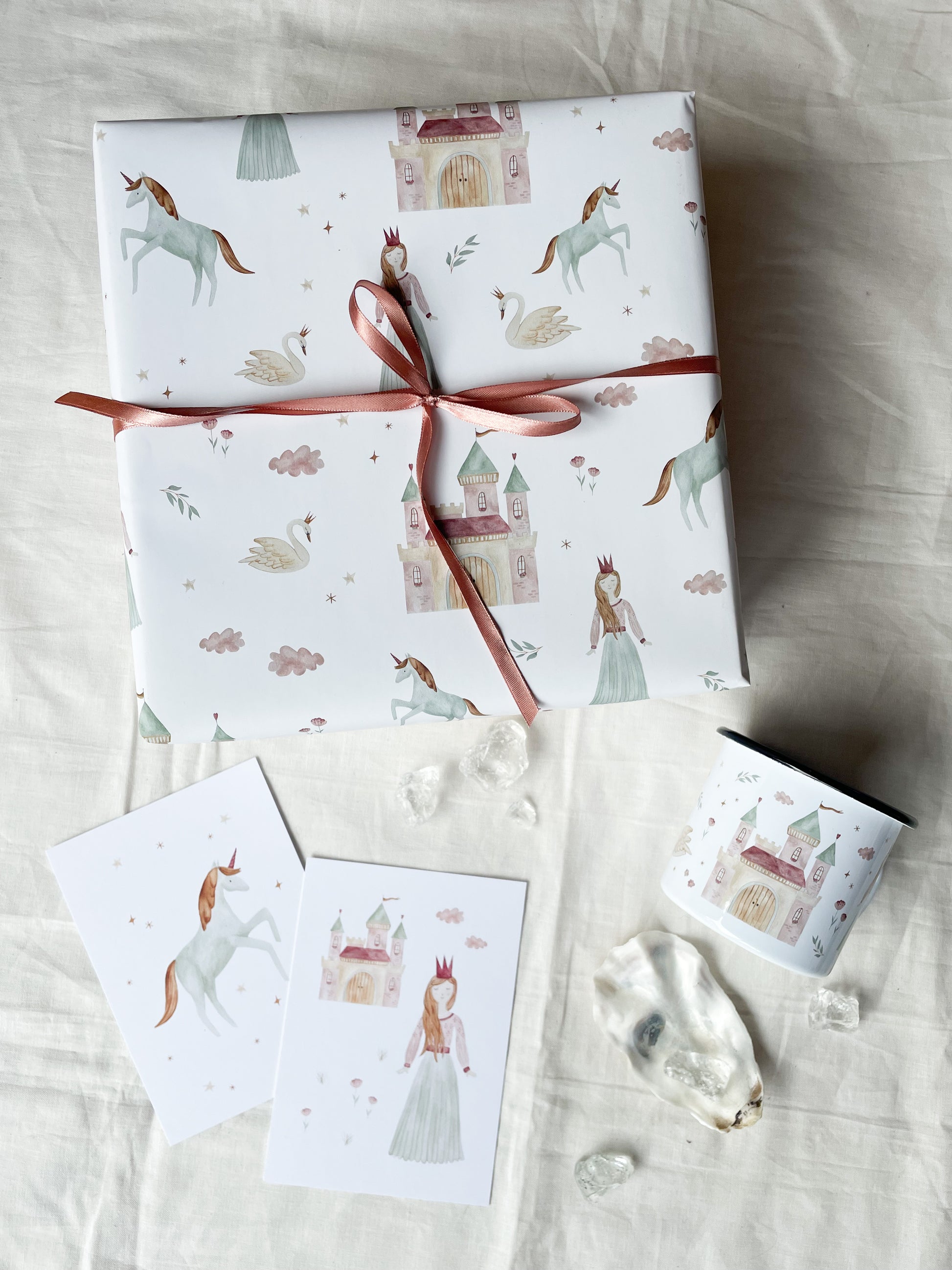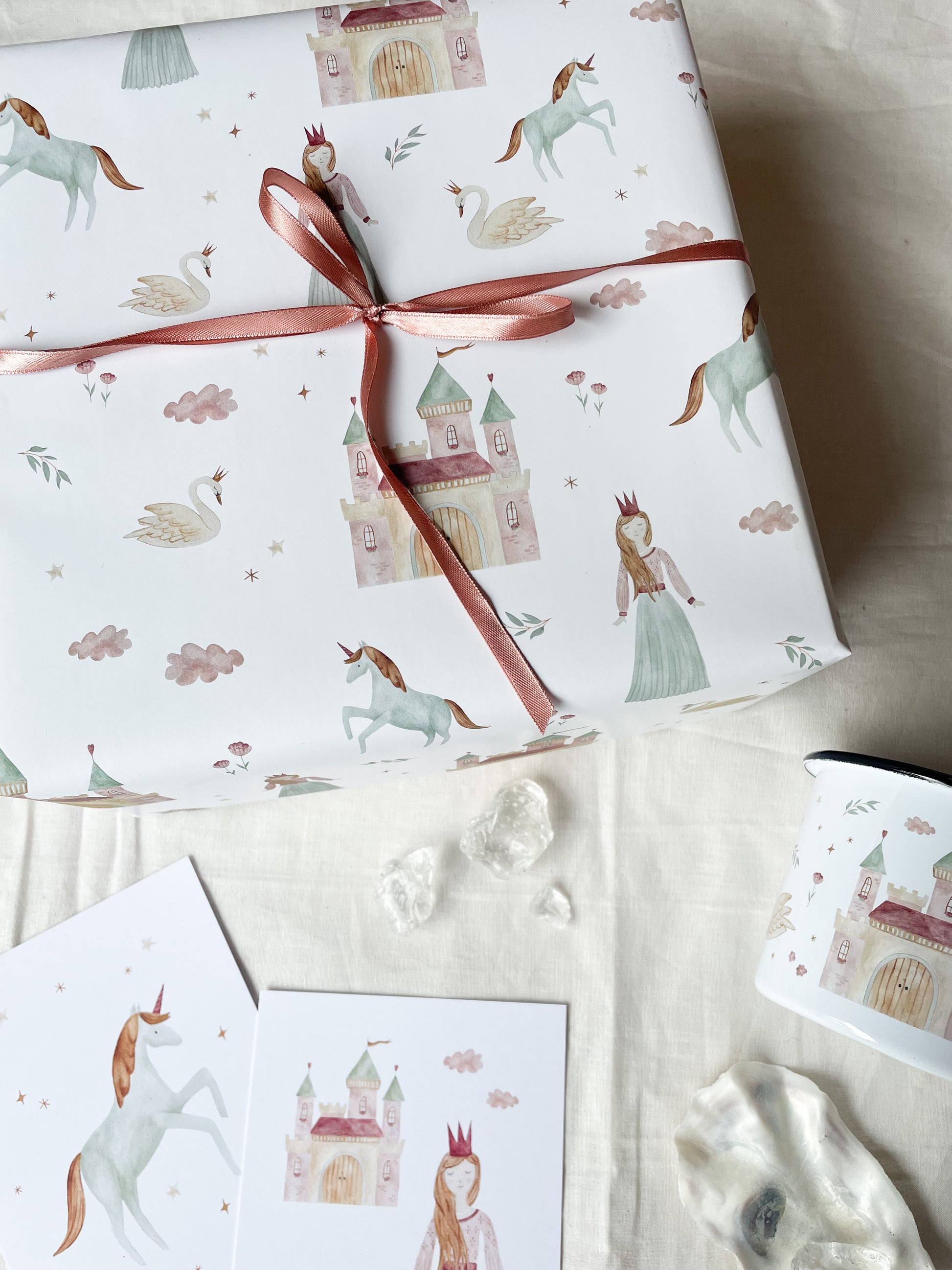 Liebevoll illustriertes Geschenkpapier mit handgemalten Motiven für einen lieblichen Prinzessinnen-Geburtstag.