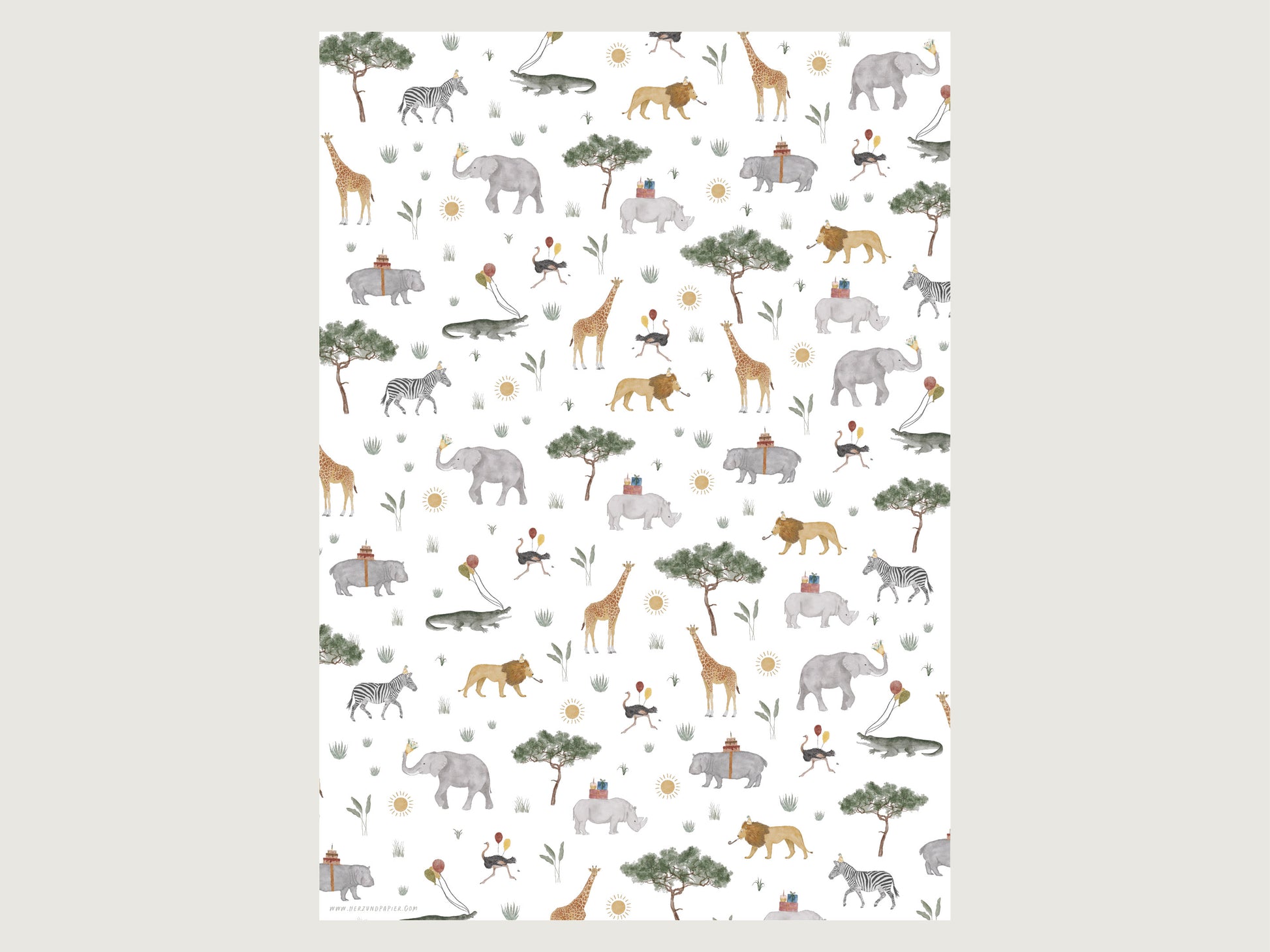 Liebevoll illustriertes Geschenkpapier mit handgemalten Motiven.