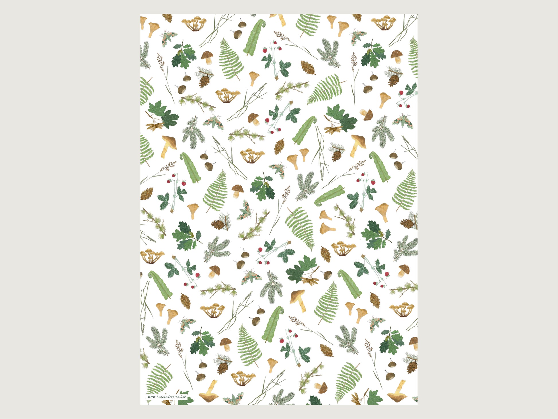 Liebevoll illustriertes Geschenkpapier mit Abbildungen rund ums Wald. Die Illustrationen wurden mit Aquarellfarben gemalt und anschließend digitalisiert.