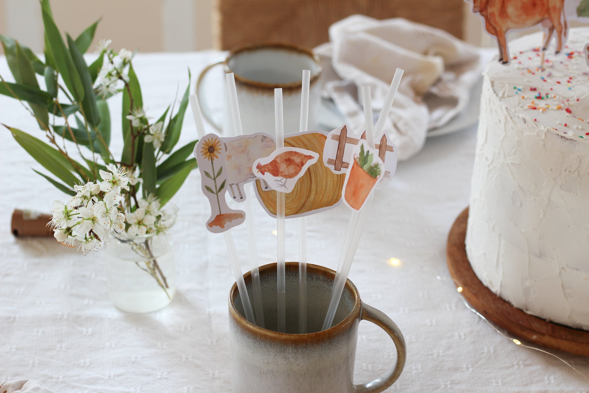 - 2 Din A4 Bögen mit kleineren Motiven. Die Motive müssen ausgeschnitten werden und können z.B. als Cake Topper, für Strohhalme oder als Streudeko genutzt werden. Auf beiden Bögen sind die gleichen Motive enthalten, allerdings spiegelverkehrt, damit du die Möglichkeit hast die Topper von vorn und hinten zu bekleben. 10 Bambusstäbe werden mitgeliefert.