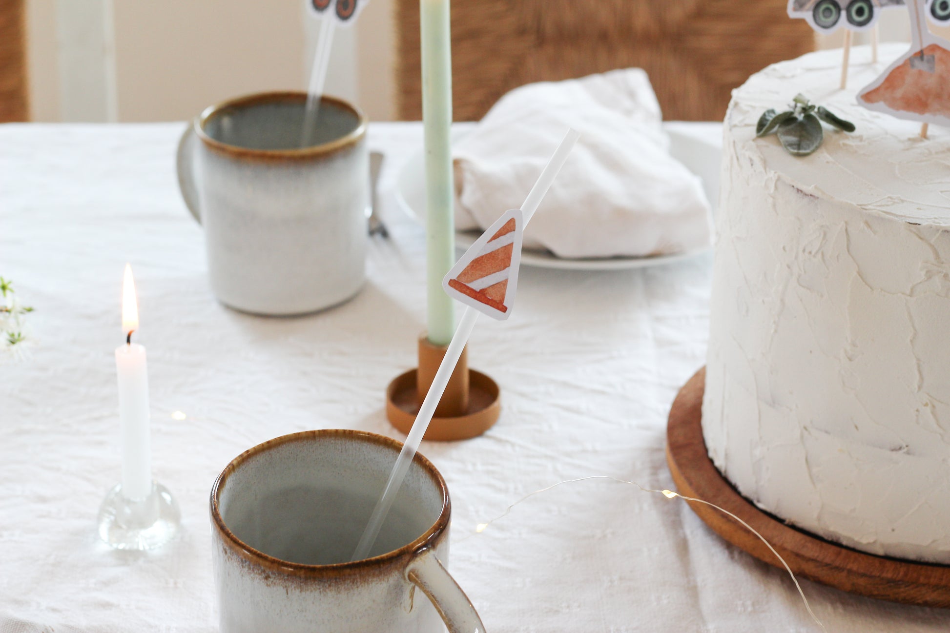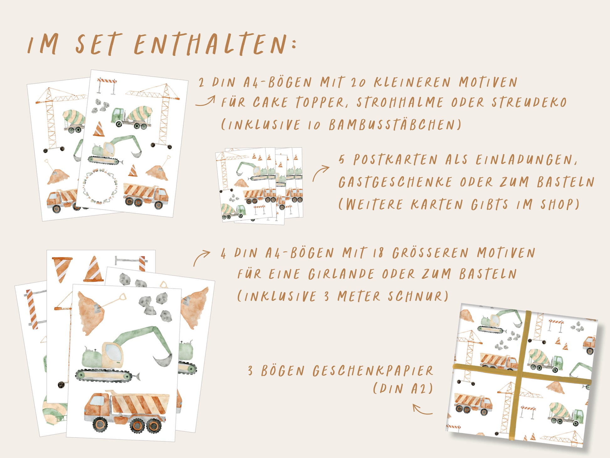 - 2 Din A4 Bögen mit kleineren Motiven. Die Motive müssen ausgeschnitten werden und können z.B. als Cake Topper, für Strohhalme oder als Streudeko genutzt werden. Auf beiden Bögen sind die gleichen Motive enthalten, allerdings spiegelverkehrt, damit du die Möglichkeit hast die Topper von vorn und hinten zu bekleben. 10 Bambusstäbe werden mitgeliefert.