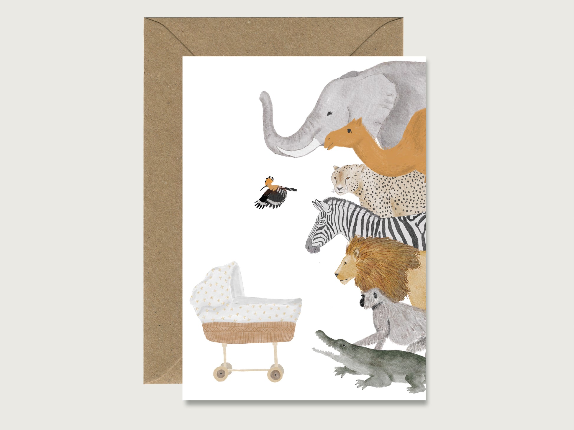 Hurra, endlich ist das Baby da! Alle sind neugierig und gespannt und wollen Hallo sagen. Mit dieser Karte kannst du deine Begeisterung und Vorfreude über den neuen Erdenbürger zum Ausdruck bringen und hast garantiert eine außergewöhnliche Karte, die die Eltern zum Schmunzeln bringt.