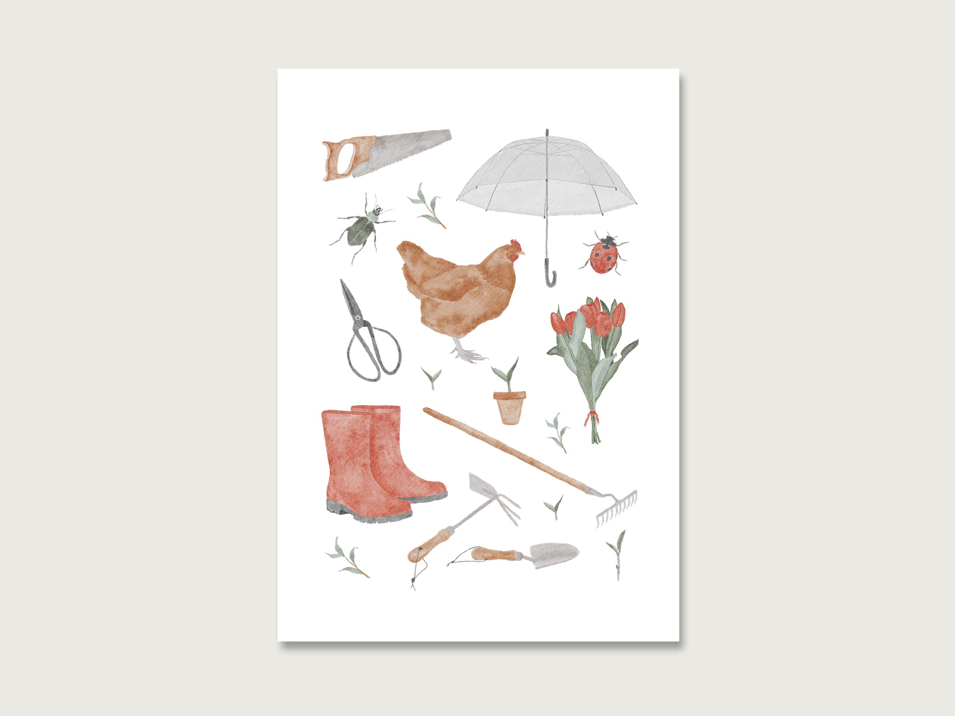 Liebevoll illustrierte Garten-Collage. Die Karte ist neutral gehalten, so kann man sie für verschiedene Anlässe verwenden. Oder einfach als Mini-Print an die Wand hängen.