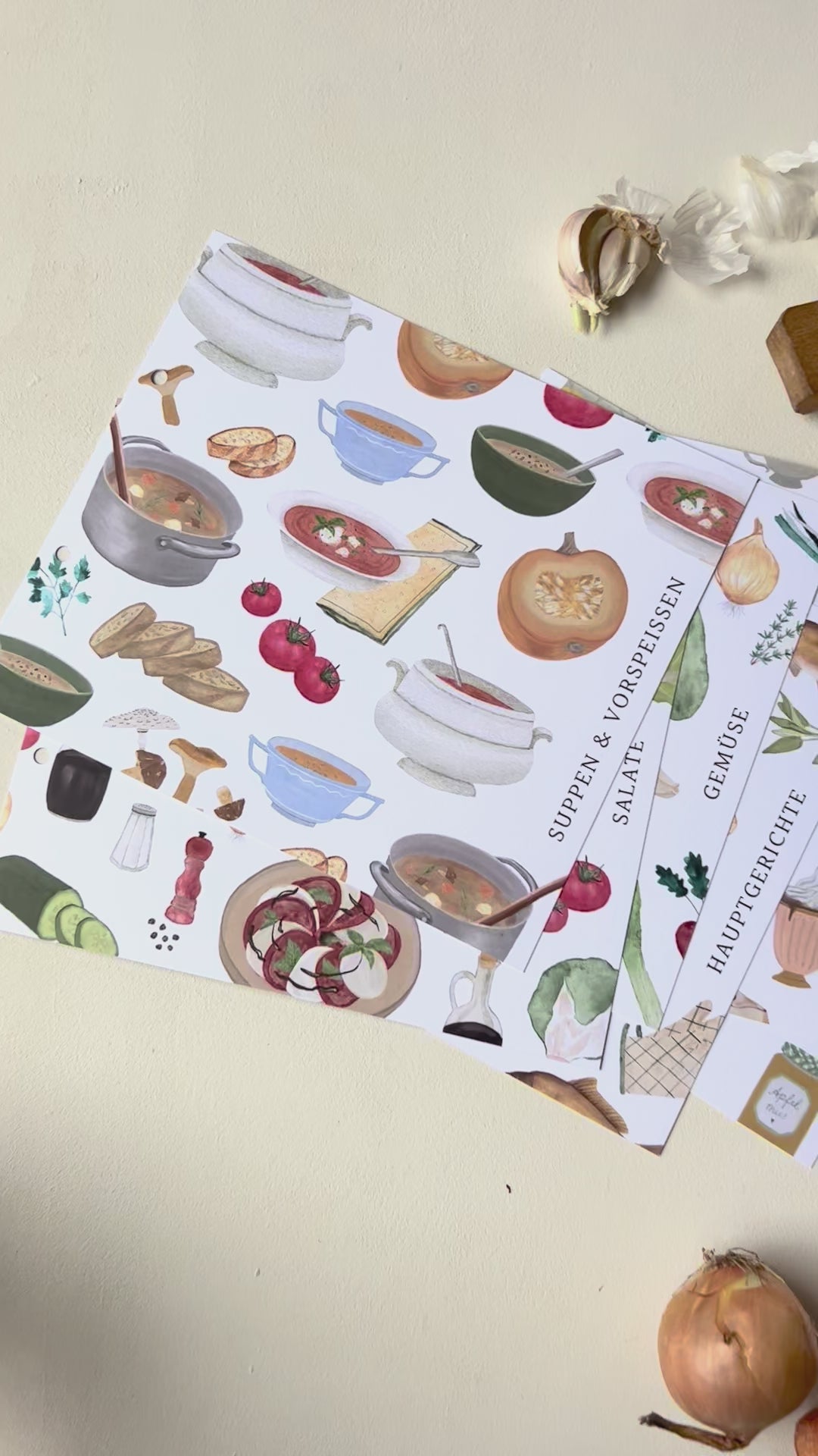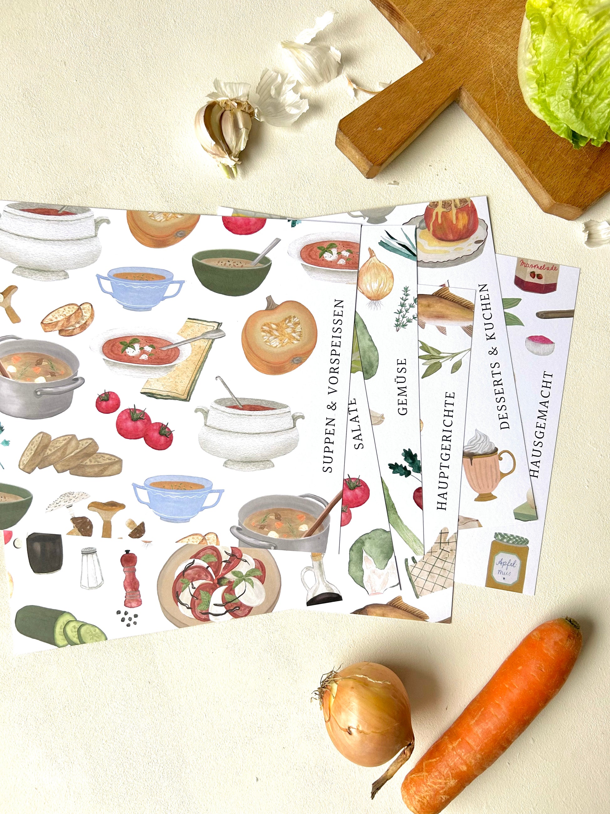 Set aus 6 Registerblättern für Rezepte im Din A4 Format. Die 6 Register umfassen die folgenden Kategorien:
