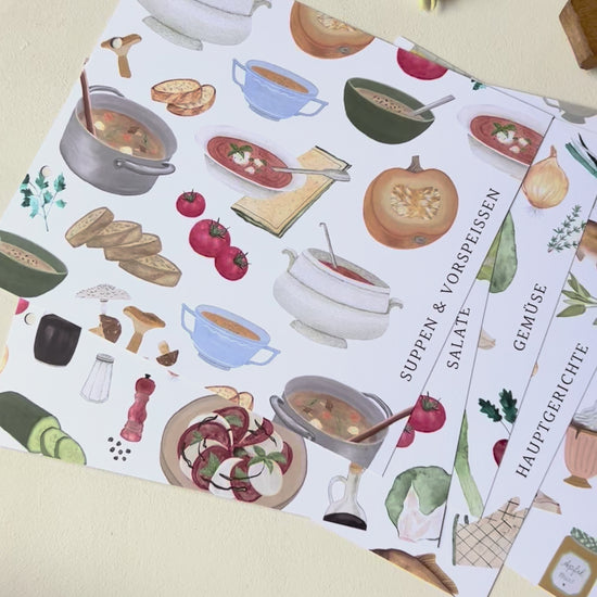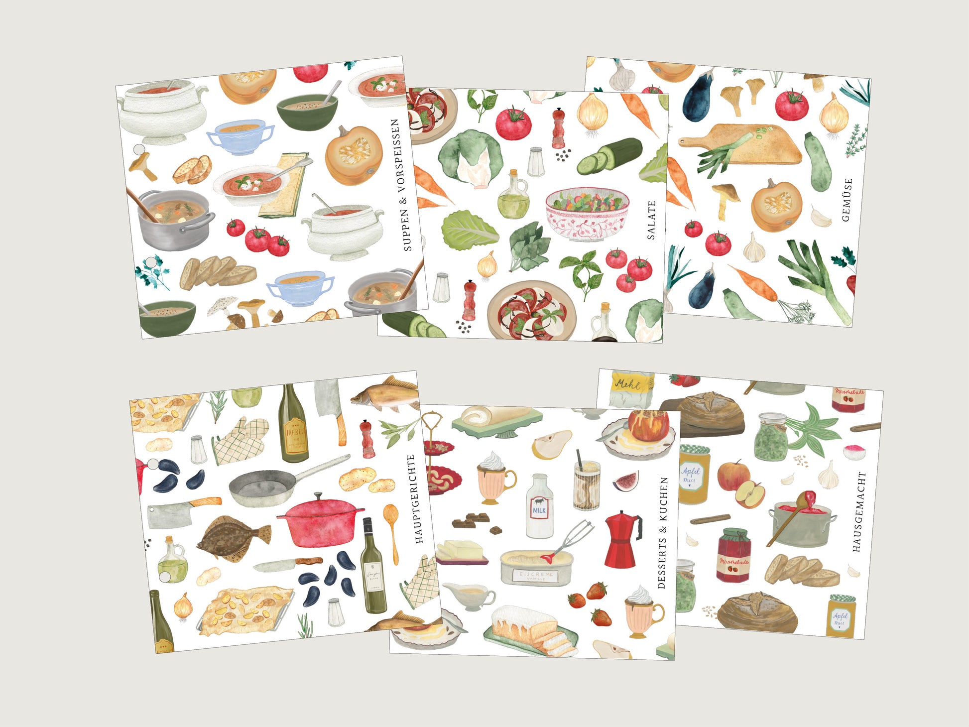 Die Illustrationen wurden alle von mir liebevoll handgemalt. Jede Kategorie ist mit passenden Illustrationen zum jeweiligen Thema versehen.